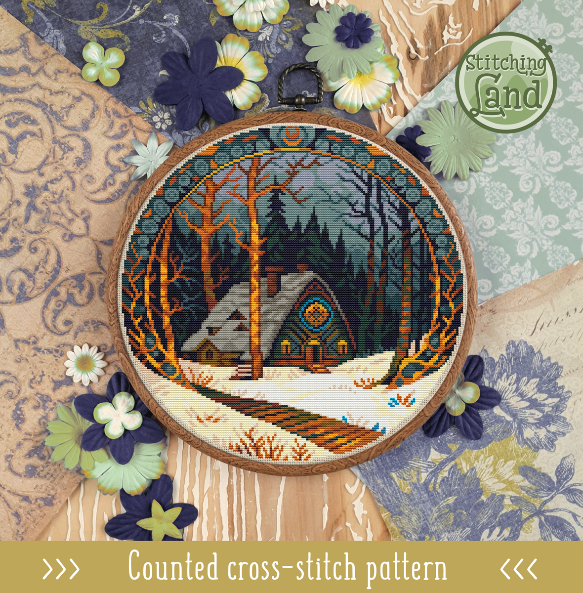 Winter Forest Cabin Cross Stitch Pattern